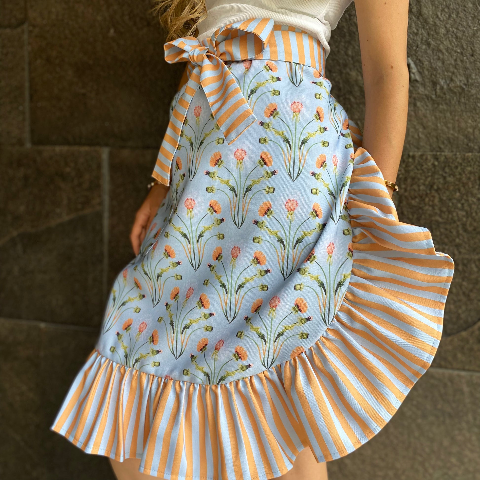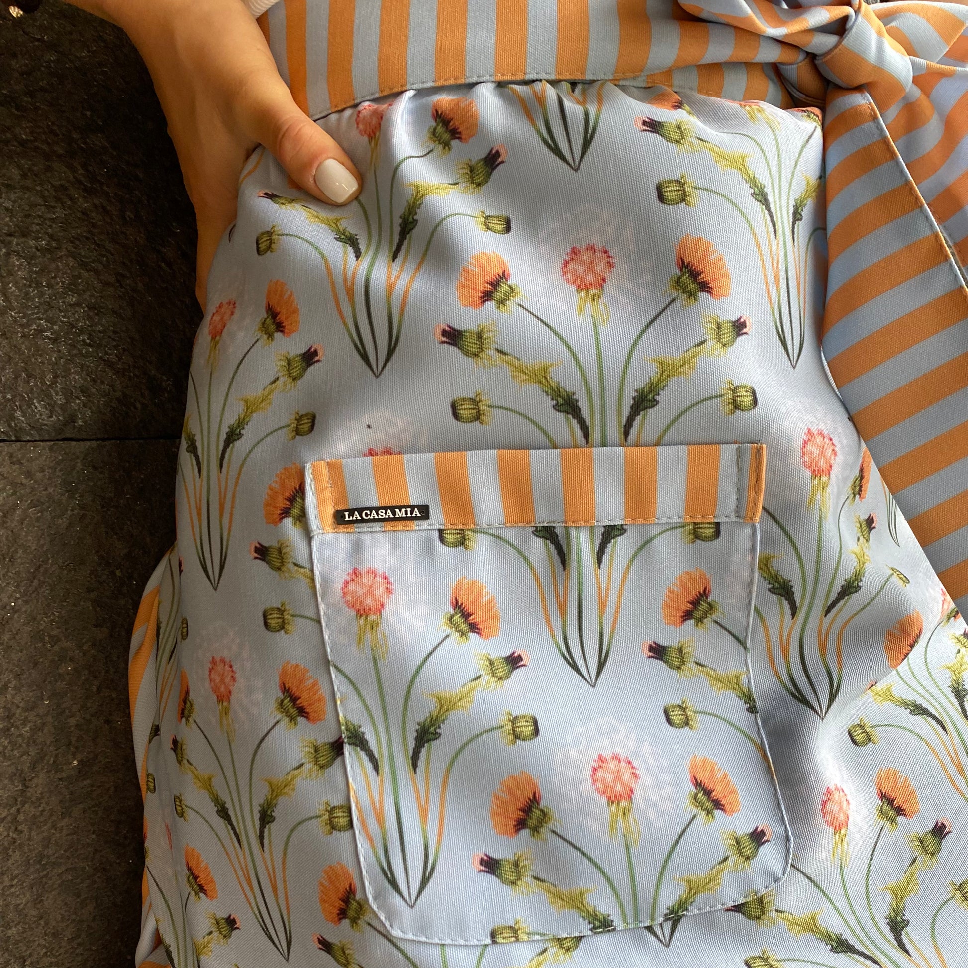 Delantal de borde ancho con volantes y un lazo ceñido a la cintura, lo cual le da un toque vintage. Con estampados vivos que alegran cualquier comida.